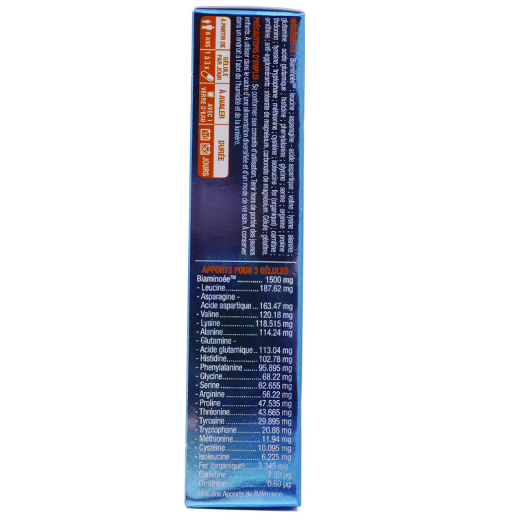 Sans caféine. BiaminoéeTM : leucine ; asparagine - acide aspartique ; valine ; lysine ; alanine ; glutamine - acide glutamique ; histidine ; phenylalanine ; glycine ; serine ; arginine ; proline ; thréonine ; tyrosine ; tryptophane ; méthionine ; cystéine ; isoleucine ; fer (organique) ; carnitine ; ornithine ; anti-agglomérants : stéarate de magnésium, carbonate de magnésium. Gélule : gélatine.