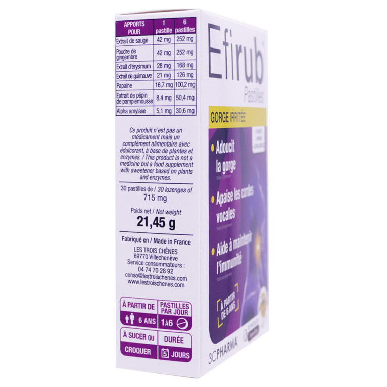 3C PHARMA EFIRUB GORGE IRRITÉE 30 PASTILLES SAVEUR COLA est disponible en vente en ligne sur le site de votre parapharmacie à prix discount.