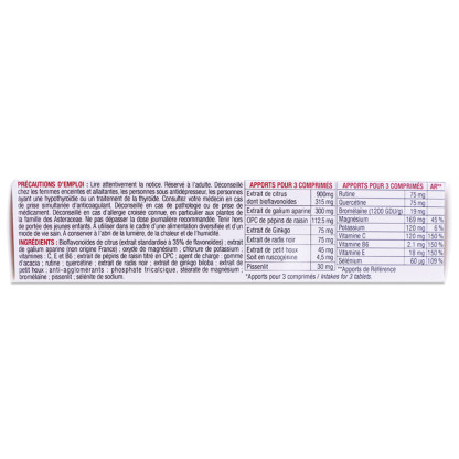 Apports pour 3 comprimés : Bioflavoïdes de citrus : 900 mg Extrait de galium aparine : 300 mg OPC de pépins de raisin : 112 mg Extrait de ginkgo : 75 mg Rutine : 75 mg Quercétine : 75 mg Bromélaïne (1200 GDU/g) : 30 mg Extrait de radis noir : 75 mg Extrait de petit houx : 45 mg Soit en ruscogénine : 4,5 mg Sélénium : 62 μg (112% AR*) Pissenlit : 30 mg Magnésium : 168 mg (45% AR*) Potassium : 119 mg (6 % AR*) Vitamine C : 120 mg (150% AR*) Vitamine B6 : 2.5 mg (150% AR*) Vitamine E : 18 mg (150% AR*). *AR : Apports de référence