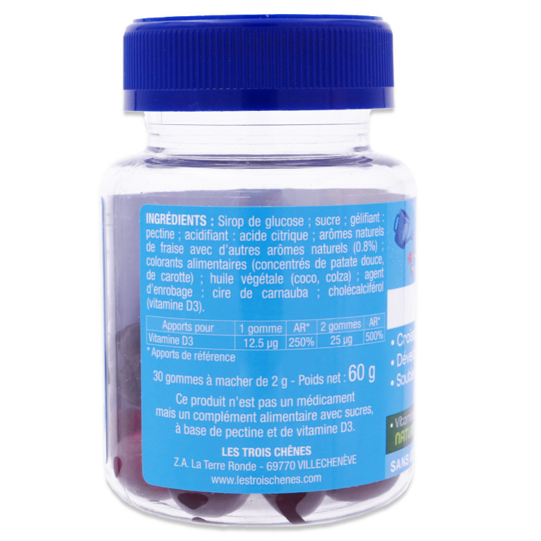 Apports nutritionnels : pour 1 gomme Vitamine D3 12,5µg 250% AR* ; pour 2 gommes 25µg 500% AR* .