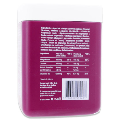 Gomme arabique (Acacia) ; Aquamin Mg Soluble – Citrate de magnésium marin (100 mg) ; Glycérophosphate de magnésium (70 mg) ; Bisglycinate de magnésium (80 mg) ; Citrate de magnésium (50 mg); Taurine ; Arôme naturel ; Glycosides de stéviol ; Concentré (Radis, Pomme et Cassis) ; Régulateur d’acidité : acide citrique ; Extrait de stigmates de safran (Crocus sativus) ; Chlorhydrate de pyridoxine (Vitamine B6).Ce produit peut contenir des traces de poissons, mollusques, crustacés, arachides et sésame en raison des conditions de fabrication.