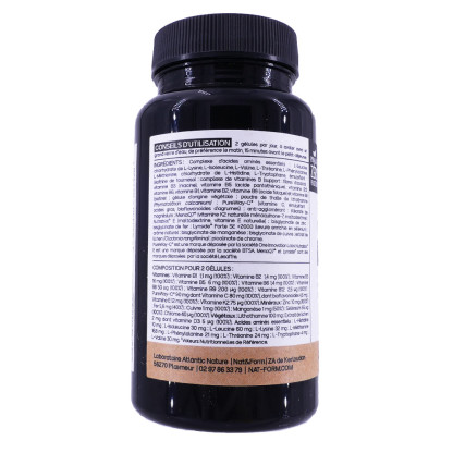 Ingrédients : Complexe d’acides aminés essentiels : L-Leucine, L-Lysine, L-Isoleucine, L-Valine, L-Thréonine, L-Phénylalanine, L-Tryptophane,L-Méthionine, L-Histidine, émulsifiant : lécithine de tournesol, Complexe de vitamines B (support : fibres d’acacia) : vitamine B3 (niacine), vitamine B5 (acide pantothénique), vitamine B12, vitamine B6, vitamine B1, vitamine B2, Vitamine B9 (acide folique) et vitamine B8 (biotine) ; gélule d’origine végétale ; poudre de thalle de lithothamne (Phymatolithon calcareum) ; PureWay-C®: vitamine C, émulsifiant : acides gras, bioflavonoïdes d’agrumes ; Nutrabiol® E : maltodextrine, vitamine E naturelle ; bisglycinate de zinc ; bisglycinate de fer ; levure enrichie en sélénium ; bisglycinate de manganèse ; bisglycinate de cuivre ; extrait de lichen (Cladonia rangiferina) ; picolinate de chrome ; MenaQ7® : vitamine K2 naturelle (ménaquinone-7).PureWay-C® est une marque déposée par la société One Innovation Labs. Nutrabiol® E est une marque déposée par la société BTSA.MenaQ7® est une marque déposée par la société Lesaffre.