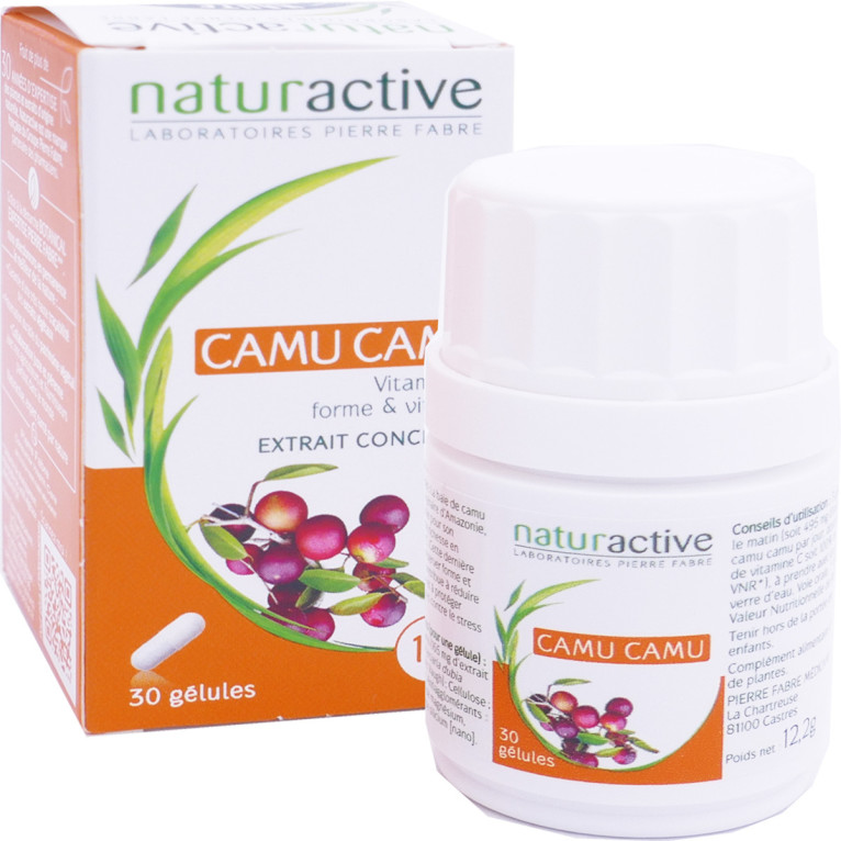 Le Camu-camu est une petite baie rouge originaire d’Amazonie souvent utilisé en cuisine par la population péruvienne, brésilienne et colombienne. Cette petite baie rouge issue d’un arbuste qui peut mesurer jusqu’à 5 mètre de haut appelé Camu-camu contient de la vitamine C qui contribue à réduire la fatigue. 6 à 8 kilogrammes de plantes sont nécessaires pour obtenir 1 kilogramme d'extrait.