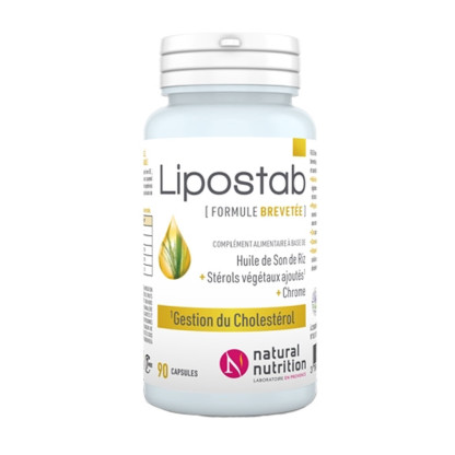 NATURAL NUTRITION LIPOSTAB contient de l'huile de son de riz, des phytostérols, du zinc, du chrome et de la vitamine E naturelle. L'huile de son de riz est une source abondante d'acides gras insaturés. Elle contient également du gamma-oryzanol, un composant caractéristique de cette huile, ainsi que des tocotriénols, qui constituent une forme de vitamine E. Les phytostérols jouent un rôle essentiel dans le maintien d'un taux de cholestérol normal en limitant l'absorption intestinale du cholestérol, à condition de consommer quotidiennement au moins 0,8 g. Le zinc joue un rôle essentiel dans le métabolisme normal des acides gras. Le chrome joue un rôle dans le métabolisme normal des macronutriments. La vitamine E d'origine naturelle contribue à préserver les cellules des effets du stress oxydatif, un processus qui est fortement associé au cholestérol.