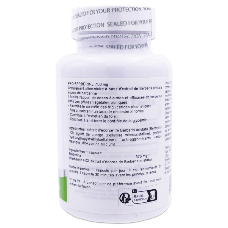 Ingrédients Pour 2 gélules : Berbérine (Berbérine HCl, extrait sec de racine de Berberis aristata) 1500 mg*. *VNR : Valeurs Nutritives de Référence..