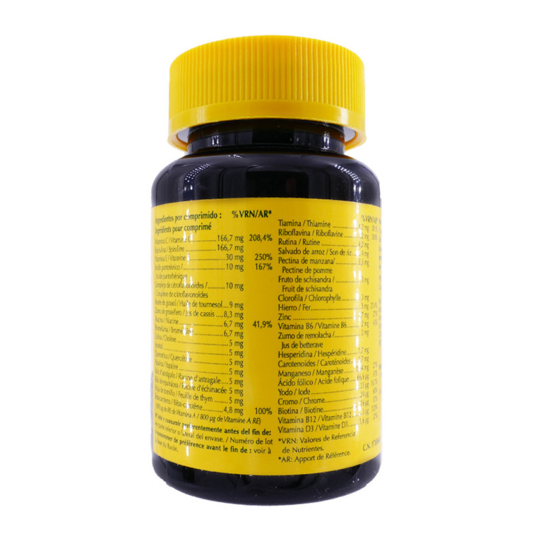 Pour 1 comprimé : Vitamine C (166,7 mg), Spiruline (166,7 mg), Vitamine E (30 mg), Huile de tournesol (11,7 mg), Vitamine B5 (10 mg), Citroflavonoïdes (10 mg), Jus de cassis (8,3 mg), Vitamine B3 (6,7 mg), Bromélaïne (6,7 mg), Choline (5 mg), Inositol (5 mg), Quercétine (5 mg), Papaïne (5 mg), Racine d'astragale (5 mg), Herbe d'orge (5 mg), Racine d'échinacée (5 mg), Mousse d'Irlande (5 mg), Feuille de thym (5 mg), Fruit de Schisandra (5 mg), Vitamine A (4,8 mg) vitamine B1 (4,2 mg), Vitamine B2 (4,2 mg), Rutine (4,2 mg), Moutarde brune (4 mg), Pectine de pomme (3,3 mg), Son de riz (3 mg), Fer (3 mg),Zinc (2,7 mg), Vitamine B6 (2 mg), Jus de betterave (2 mg), Hespéridine (1,7 mg), Chlorophylle (1,25 mg), Caroténoïdes (0,7 mg), Manganèse (0,54 mg), Acide folique (66,6 μg), Iode (25 μg), Chrome (24 μg), Vitamine B8 (16 μg), Vitamine B12 (3 μg), Vitamine D2 (1,6 μg).