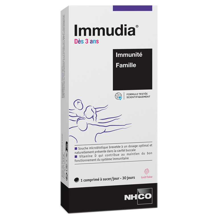 IMMUDIA 3+ Immunité de NHCO Nutrition, des souches microbiotiques et de la vitamine D qui contribue au maintien du bon fonctionnement des défenses immunitaires de l’organisme des enfants dans un complément alimentaire en comprimés à sucer, dans votre parapharmacie en ligne. A partir de 3 ans.