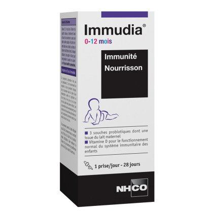 IMMUDIA 0-12 mois IMMUNITÉ laboratoire NHCO Nutrition, des souches microbiotiques adaptés au nourrisson et des vitamines dans votre parapharmacie en ligne, dans un complément alimentaire avec de la vitamine D qui contribue au fonctionnement des défenses naturelles chez les tout-petits dès la naissance jusqu’à 1 an.
