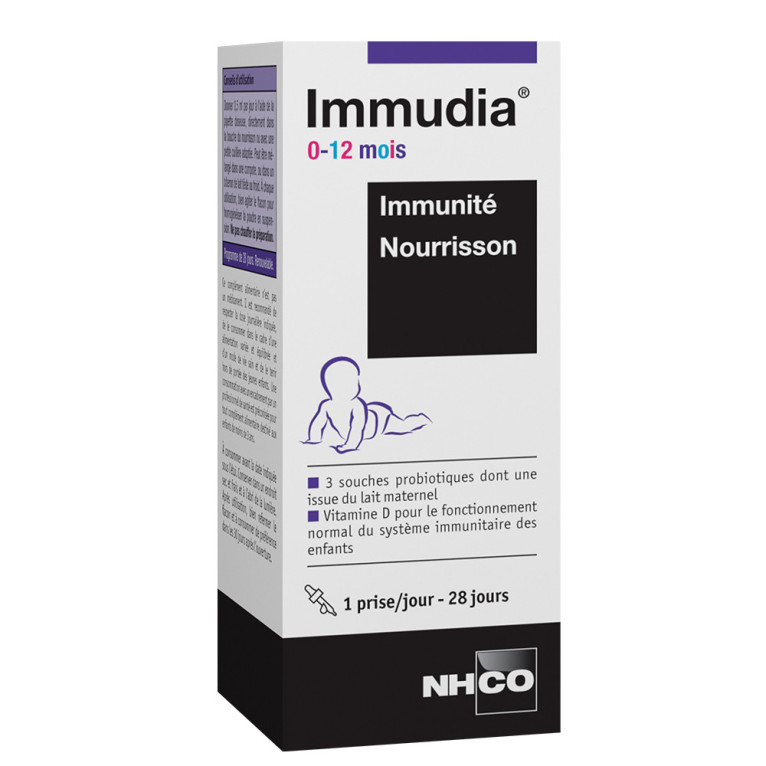 IMMUDIA 0-12 mois conditionné sous forme de compte-gouttes est un complément alimentaire formulé à base de 3 souches microbiotiques adaptées au nourrisson et de vitamine D. La vitamine D contribue au fonctionnement normal du système immunitaire chez les enfants.