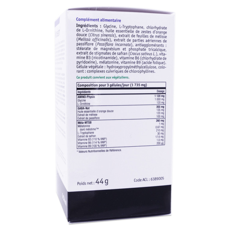 Ingrédients : Glycine, L-Tryptophane, chlorhydrate de L-Ornithine, huile essentielle de zestes d’orange douce (Citrus sinensis), extrait de feuilles de mélisse (Melissa officinalis), extrait de parties aériennes de passiflore (Passiflora incarnata), anti-agglomérants : stéarate de magnésium et phosphate tricalcique, extrait de stigmates de safran (Crocus sativus L.), vitamine B3 (nicotinamide), vitamine B6 (chlorhydrate de pyridoxine), mélatonine, vitamine B9 (acide folique). Gélule végétale : hydroxypropylméthylcellulose, colorant : complexes cuivriques de chlorophyllines.