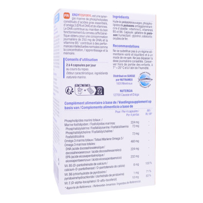 ErgyFosforyl Performances Intellectuelles du laboratoire NUTERGIA, est un complément alimentaire à base de vitamine B6, qui contribue à des performances intellectuelles normales comme l'apprentissage, et de DHA, des oméga 3, qui participe au bon fonctionnement du cerveau.