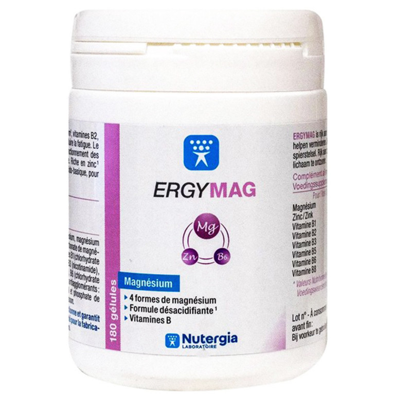 ERGYMAG du Laboratoire NUTERGIA est un complément alimentaire conditionné sous forme de gélules, composé de vitamines du groupe B, de magnésium et de zinc. Les vitamines B12, B6 et le magnésium contribuent à réduire la fatigue.