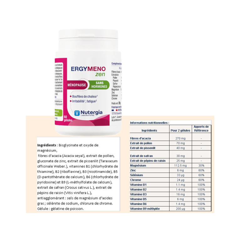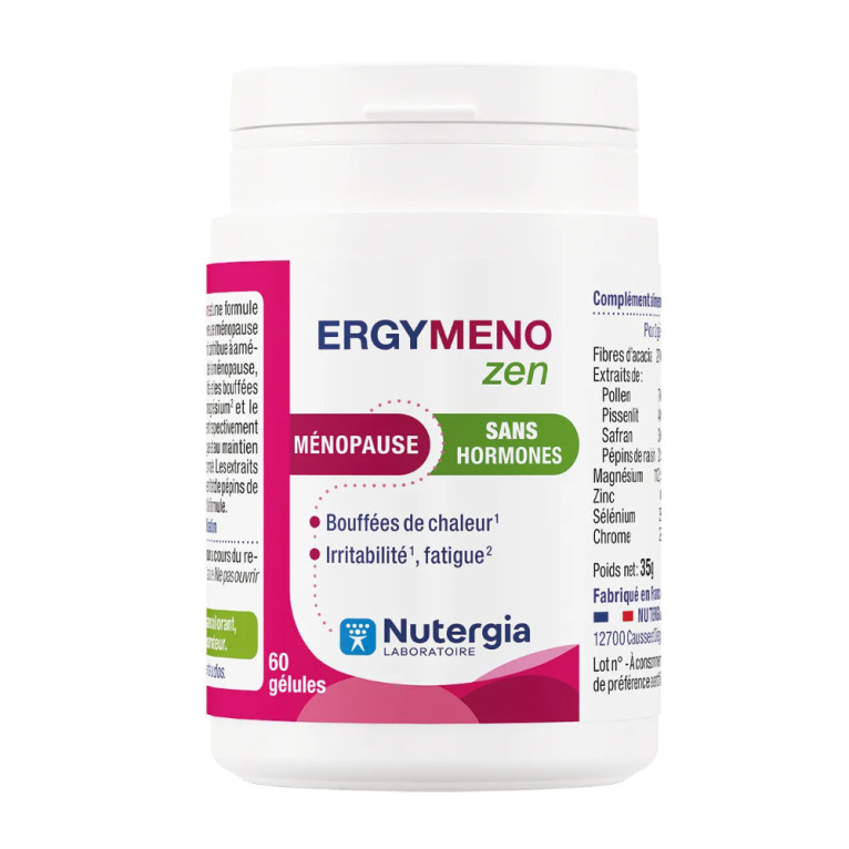 Elles sont formulées par le laboratoire Nutergia, expert en nutrition cellulaire active, pour aider les femmes à traverser les désagréments liés à cette étape de la vie. Sa composition naturelle est à base de plantes comme le safran, qui contribue à réduire les bouffées de chaleur, et l'irritabilité notamment pendant cette période. Ce complément alimentaire sans hormones contient également des minéraux, vitamines et oligo-éléments dont le magnésium et chrome pour contribuer à réduire la fatigue et au maintien d'une glycémie normale. Les gélules NUTERGIA ERGYMENO ZEN MENOPAUSE sont également à base d'extraits de pollen, pissenlit, et pépins de raisin.
