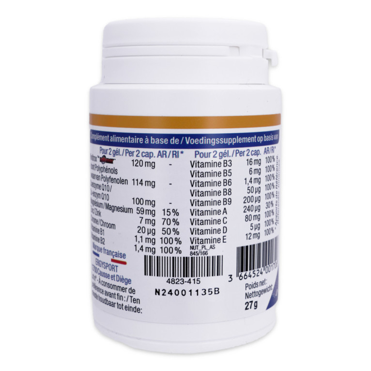 Ingrédients : Antiagglomérants : phosphate dicalcique et sels de magnésium d'acides gras ; hydroxyde de magnésium, Vinitrox™ : extraits de pomme (Malus pumila Mill.) et de raisin (Vitis vinifera L.) [SULFITES] ; coenzyme Q10, vitamine C (acide L-ascorbique), extrait d'acérola (Malpighia glabra L., maltodextrine, vitamine C), citrate de zinc, vitamines B3 (nicotinamide), E (succinate acide de D-alphatocophéryle), B5 (D-pantothénate de calcium), A (acétate de rétinyle), D3 (cholécalciférol), B2 (riboflavine), B6 (chlorhydrate de pyridoxine), B1 (chlorhydrate de thiamine), B9 (acide folique), B8 (D-biotine), chlorure de chromeGélule : gélatine de POISSON, colorant : oxyde et hydroxyde de fer