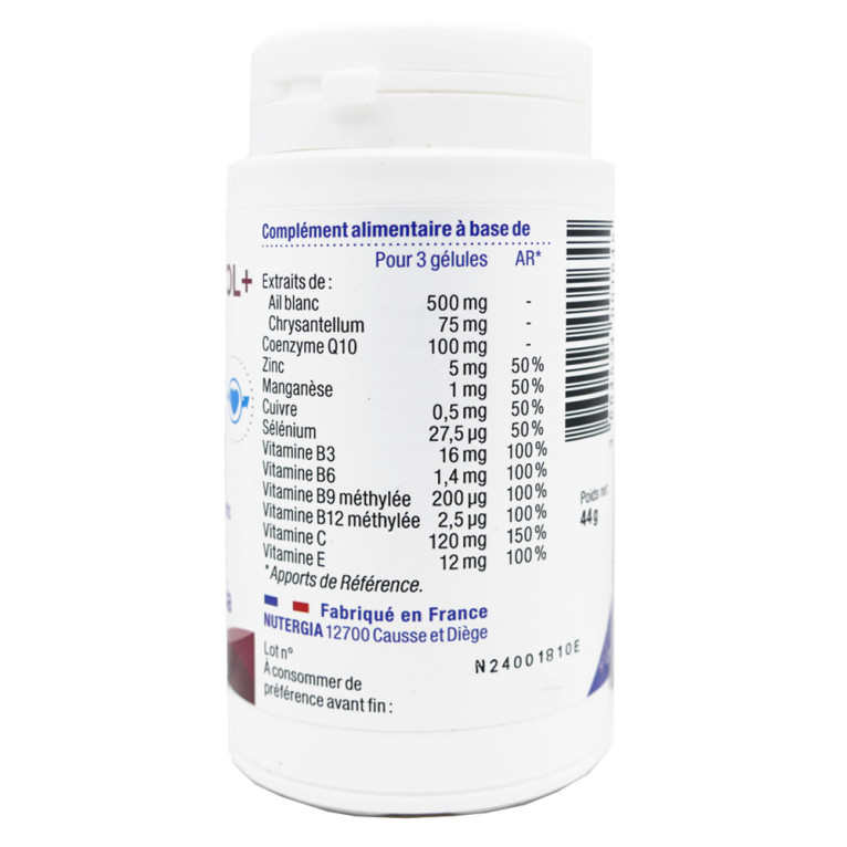 Le complément alimentaire Ergysterol+ Cholestérol est spécialement conçu pour rétablir les déséquilibres de taux de lipides dans le sang grâce à une synergie de plantes, de minéraux et de vitamines. L'ail blanc joue un rôle bénéfique pour la santé des vaisseaux sanguins en aidant à réguler les niveaux de lipides dans le sang. Il contribue également à maintenir un taux de cholestérol normal. Sa composition est riche en antioxydants, grâce à la présence de zinc, de manganèse, de cuivre et de sélénium, qui aident à la protection des cellules du stress oxydatif. Le coenzyme Q10, souvent désigné sous le nom de coQ10, est un composé que l'on trouve dans les mitochondries. Les vitamines B9 et B12 présentes dans ERGYSTEROL+ sont en forme méthylée, ce qui les rend plus efficaces.