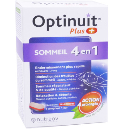 OPTINUIT Sommeil 4 en 1 de NUTREOV est un complément alimentaire conditionné sous forme de comprimés tri-couches.Sa composition associe des plantes : mélisse, rhodiole, aubépine, ballote noire à de la mélatonine (hormone du sommeil naturelle) et de la vitamine B6. La mélatonine à un dosage de 1mg favorise un sommeil normal et participe à s'endormir de façon naturelle*. Elle contribue à la réduction des effets du décalage horaire dès 0.5mg **.La vitamine B6 favorise la réduction de la fatigue.