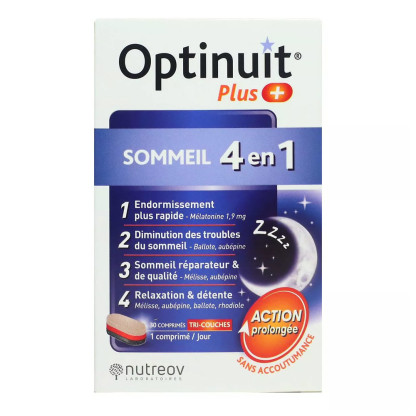 OPTINUIT Plus Sommeil 4 en 1 de NUTREOV est un complément alimentaire conditionné sous forme de comprimés tri-couches conçu pour aider naturellement et sans risque d’accoutumance lors de difficulté d’endormissement. Sa composition associe des plantes : mélisse, rhodiole, aubépine, ballote noire, à de la mélatonine (hormone du sommeil naturelle). La mélisse contribue à une relaxation optimale et à un sommeil normal ; l’aubépine aide à trouver un meilleur sommeil ; la rhodiole aide l’organisme à s’adapter au stress émotionnel qui sera bénéfique lors de troubles du sommeil. Ces comprimés tri-couches permettent de libérer les actifs rapidement et prolongée pour des résultats efficaces tout au long de la nuit.