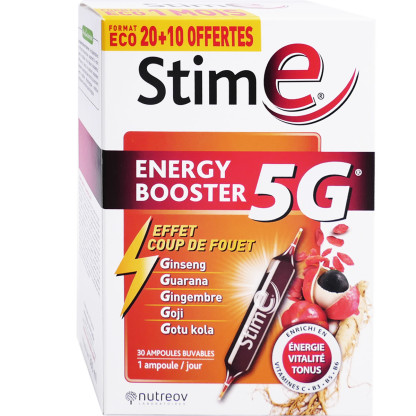 STIM E Energie Booster 5G de NUTREOV est un complément alimentaire sous forme d’ampoules buvables, composé de 5 extraits de plantes et vitamines. Le Ginseng augmente l’endurance et maintien le bien-être physique ; le Gingembre maintient l’immunité et possède des propriétés antioxydantes ; le Guarana (source de caféine) améliore la vigilance et réduit la fatigue mentale ; les vitamines B et la vitamine C (apportée par un extrait d’acérola) aident à réduire la fatigue. La L-arginine qui est un acide aminé complète la formule afin de contribuer à la synthèse des protéines essentielles pour un bon fonctionnement de l’organisme