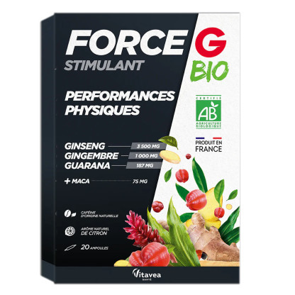 Force G Stimulant Performance Physique de NUTRISANTE est un complément alimentaire sous forme d’ampoules buvables au goût citronné, 100% naturel, sans conservateur et sans colorant composé de Ginseng bio, de Gingembre bio, de Guarana et de Maca. Dans cette formule, le ginseng permet d'aider en cas de fatigue ou de stress, le guarana quant à lui améliore la vigilance et aide à maintenir la vitalité physique et mentale. Enfin le Maca favorise le désir sexuel.