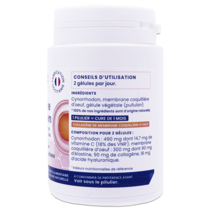 COMPOSITION POUR 2 GÉLULES : Cynorrhodon : 490 mg, dont 14,7 mg de vitamine C (18% des Valeurs Nutritionnelles de Référence), Membrane coquillière d’œuf : 300 mg, dont 90 mg d'élastine, 90 mg de collagène, 18 mg d'acide hyaluronique.