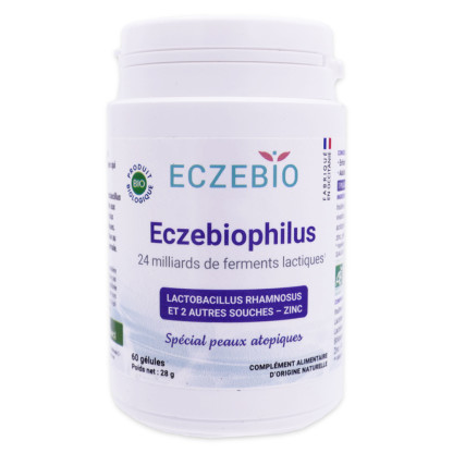 OEMINE ECZEBIOPHILUS en vente en ligne, sur le site de votre parapharmacie à prix discount, est un complément alimentaire composé de 3 souches microbiotiques et de zinc qui va favoriser le maintien d'une peau normale.