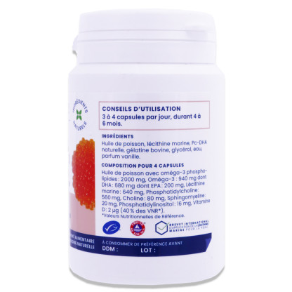 Complément alimentaire à base d'oméga 3 et vitamine D.Ingrédients : Huile de poisson, Lécithine marine, Pc-DHA naturelle, Gélatine bovine, Glycérol, Eau, Parfum vanille.Composition pour 4 capsules : Huile de poisson : 2 000 mg dont lécithine marine : 640 mg, dont phospholipides : 640 mg, dont phosphatidylcholine : 560 mg, dont choline : 83 mg, Oméga-3 : 940 mg dont DHA : 220 mg et EPA : 70 mg Vitamine D : 2 µg (40% des VNR*). * Valeurs nutritionnelles de référence.