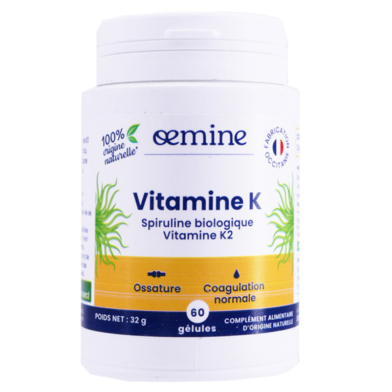 Les 60 gélules de Vitamine K offrent une solution naturelle pour les enfants et les adolescents en période de croissance, mais également chez les séniors combiné à de la vitamine D. La Vitamine K est un nutriment essentiel pour notre organisme. Elle joue un rôle clé dans la coagulation du sang. De plus, elle contribue également à la santé des os Les gélules d'OEMINE VITAMINE K contiennent une formule concentrée en Vitamine K1 et vitamine K2, permettant une absorption optimale par l'organisme. Ce complément alimentaire est idéal pour les personnes souhaitant renforcer leur système de coagulation sanguine ou préserver leur capital osseux. En choisissant OEMINE VITAMINE K, vous optez pour un produit de qualité, élaboré avec des ingrédients naturels et respectueux de votre santé. Profitez des avantages de la Vitamine K en toute confiance grâce à ce complément alimentaire recommandé par les professionnels de la santé. N'attendez plus, commandez dès maintenant sur notre site de vente en ligne et bénéficiez d'un prix discount.