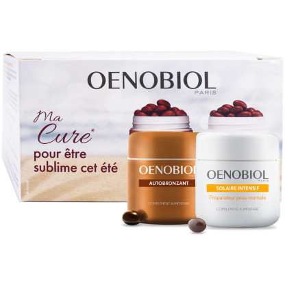 Le Coffret « Ma cure pour être sublime cet été » discount d’OENOBIOL, parce que la beauté vient de l’intérieur : 2 compléments alimentaires en capsules, réunis aux extraits naturels pour une peau sublimée avant, pendant et après l’exposition au soleil. Solaire Intensif Préparateur Peau normale (30 capsules) et Autobronzant (30 capsules).