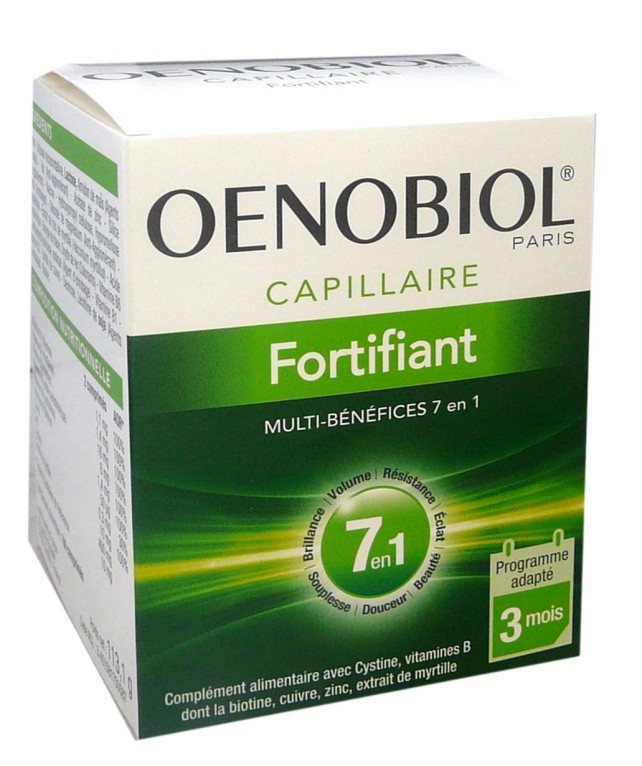 Oenobiol est la marque n°1 en France dans le domaine de la nutrition beauté, et développe depuis 1985 des compléments alimentaires de haute qualité pour répondre à tous les besoins beauté féminins : solaire, anti-âge, peau, cheveu, minceur… La gamme capillaire propose des compléments alimentaires spécialement conçus pour aider à maintenir la santé, la beauté et la vitalité des cheveux et des ongles. OENOBIOL Fortifiant capillaire conditionné sous forme de comprimés, est composé d’actifs judicieusement choisis pour leur capacité à nourrir de l’intérieur les cheveux et les ongles et leur offrir résistance, vigueur et beauté. OENOBIOL Fortifiant capillaire contient un extraite de myrtille, de la cystine, du cuivre, du zinc et des vitamines du groupe B dont l’association restaure vigueur et vitalité aux cheveux et aux ongles.