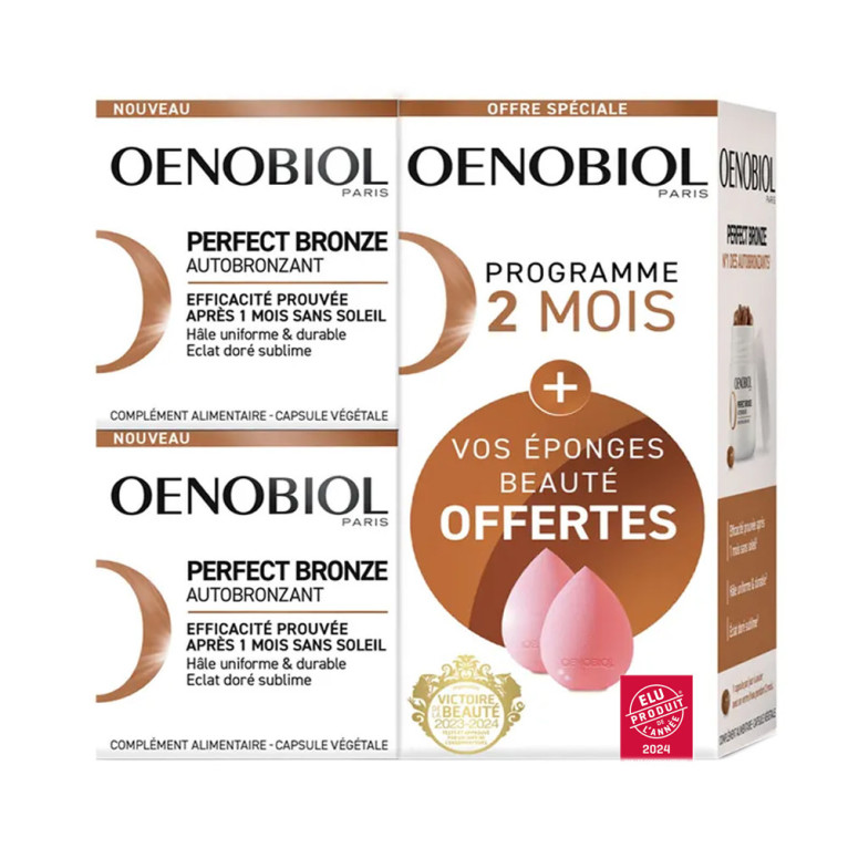 PERFECT BRONZE Autobronzant discount d’OENOBIOL, parce que la beauté vient de l’intérieur, un complément alimentaire en capsules d’origine végétale, aux extraits naturels pour une peau sublimée même sans exposition au soleil ! Pour tous types de peaux. 2 éponges beauté offertes