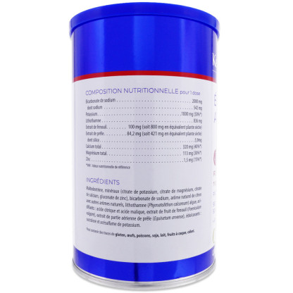 Ingrédients: Maltodextrine, minéraux (citrate de potassium, citrate de magnésium, citrate de calcium, gluconate de zinc), bicarbonate de sodium, arôme naturel de citron avec autres arômes naturels, lithothamne (Lithothamnium calcareum) algue, acidifiants : acide citrique et acide malique, extrait de partie aérienne de prêle (Equisetum arvense), extrait de fruit de fenouil (Foeniculum vulgare), édulcorants : sucralose et acésulfame de potassium. Analyse nutritionnelle pour 1 dose : Bicarbonate de sodium 2000 mg dont sodium 542 mg, Potassium 1000 mg (50%*), Lithothamne 836 mg, Extrait de fenouil 600 mg**, Extrait de prêle 400 mg** dont silicium 4 mg, Calcium total 320 mg (40%*), Magnésium total 113 mg (30%*), Zinc 1,6 mg (16%*). *VNR : valeur nutritionnelle de référence. ** équivalent plante sèche