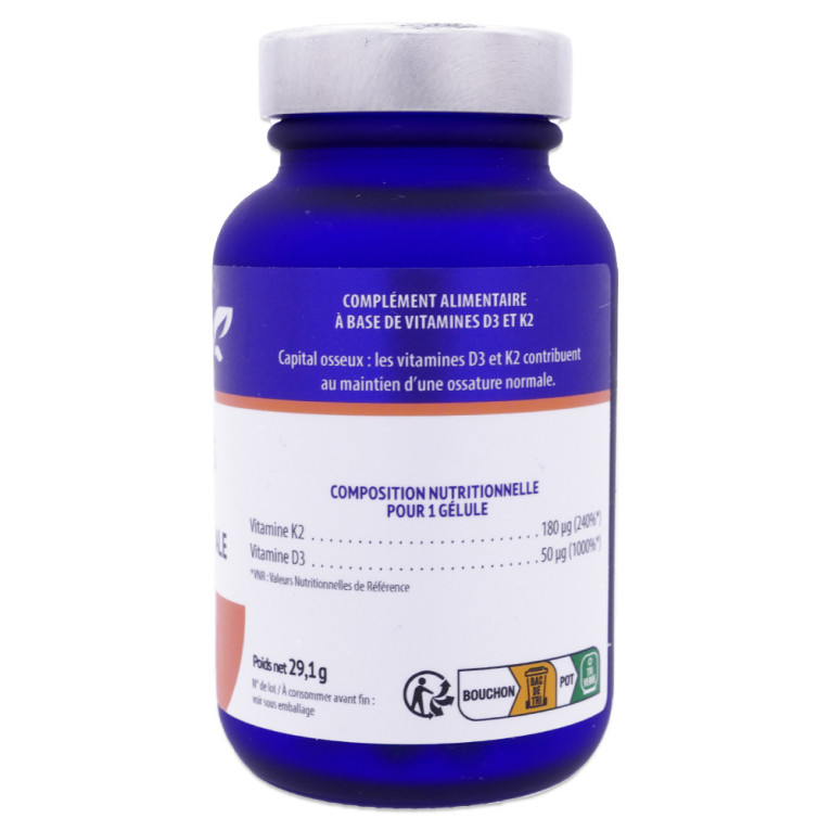 Fibre d’acacia – Enveloppe de la gélule : gélatine marine (poisson), colorant : chlorophylline – Cholécalciférol (vitamine D3) – Ménaquinone-7 (vitamine K2).