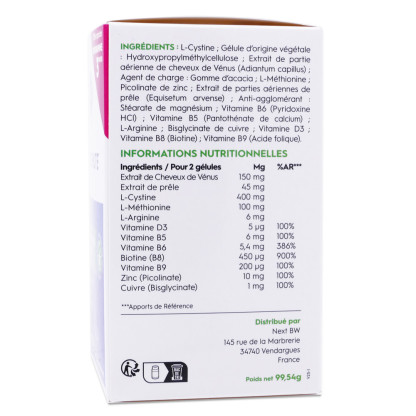 Complément alimentaire à base de plantes, vitamines et minérauxL-Cystine ; gélule d'origine végétale : hydroxypropylméthylcellulose ; extrait de partie aérienne de cheveux de Vnus (Adantum capillus) ; agent de charge : gomme dd'acacia ; L-Méthionine ; picolinate de zinc ; extrait de parties aériennes de prêle (Equisetum arvense) ; anti-agglomérant : stéarate de magnésium ; vitamine B6 (Pyridoxine HCI) ; vitamine B5 (pantothénate de calcium) ; L-Arginine ; Bisglycinate de cuivre ; vitamine D3 ; vitamine B8 (biotine) ; vitamine B9 (acide folique).La liste des ingrédients peut être soumise à des variations, nous vous conseillons de toujours vérifier la liste figurant sur le produit acheté.
