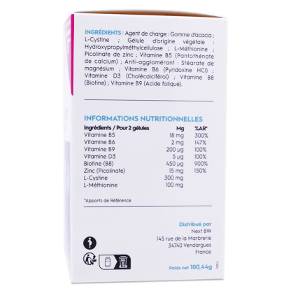Complément alimentaire à base de vitamines, minéraux et acides aminésAgent de charge : gommes d'acacia ; L-Cystine ; gélule d'origine végétale : hydroxypropylméthylcellulose ; L-Méthionine ; picolinate de zinc ; vitamine B5 (pantothénate de calcium) ; anti-agglomérant : stéarate de magnésium ; vitamine B6 (pyridoxine HCI) ; vitamine D3 (cholécalciférol) ; vitamine B8 (biotine) ; vitamine B9 (acide folique)La liste des ingrédients peut être soumise à des variations, nous vous conseillons de toujours vérifier la liste figurant sur le produit acheté.