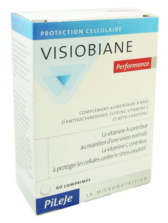 Depuis 20 ans, les laboratoires PILEJE développent des gammes complètes de compléments alimentaires de haute technicité, apportant des réponses de qualité aux consommateurs soucieux de leur santé et leur bien-être. La gamme Protection Cellulaire propose des produits formulés à base de substances (antioxydants, acides gras essentiels…) capables de stimuler le système de défense de l’organisme contre les radicaux libres et ralentir le processus naturel de vieillissement. VISIOBIANE PERFORMANCE est un complément alimentaire conditionné sous forme de comprimés, conçu pour préserver la vue en protégeant la rétine et favoriser une vue normale. Il permet de protéger l’œil de l’oxydation et des troubles de la vue, améliorer la vision nocturne, protéger des rayons ultra violets, et de maintenir une bonne vue grâce aux vitamines A, et C, de myrtille, lycopène, lutéine, zéaxanthine et béta-carotène.