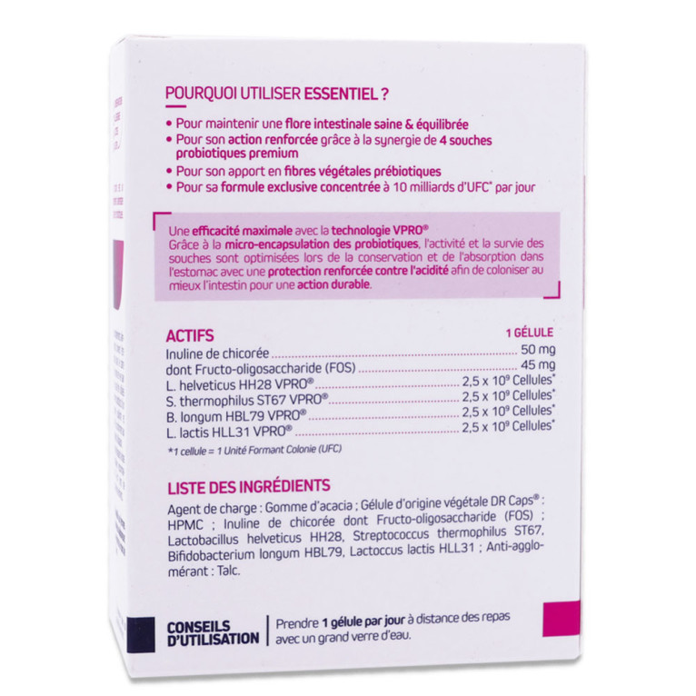 Dosage pour 1 gélule::Inuline 50 mg, Association de probiotiques :Lactobacillus helveticus HH28, Streptococcus thermophilus ST67, Bifidobacterium longum HBL79, Lactoccus lactis HLL31 (10 x 109 cellules) *1 cellule = 1 Unité Formant Colonies (UFC).