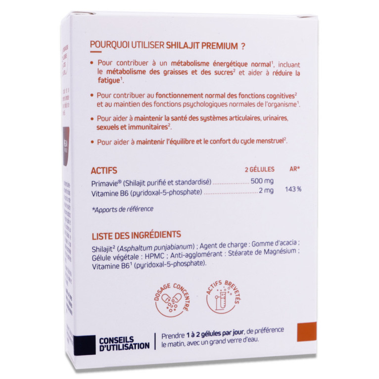Extrait purifié et standardisé de Shilajit PrimaVie® (acides fulviques ≥ 50 %, DBPs, urolithines A & B), vitamine B6 (pyridoxal-5-phosphate), gélule végétale.