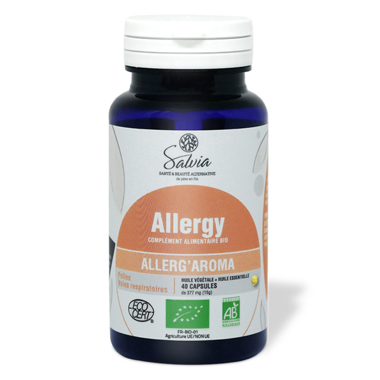Allerg’ Aroma est un complément alimentaire naturel conditionné en capsules, composé d’huile essentielle bio et huile végétale de périlla. La périlla qui est une plante, est riche en oméga 3. Allerg’ Aroma va permettre d’agir sur les voies respiratoires lors d’allergie au pollen.