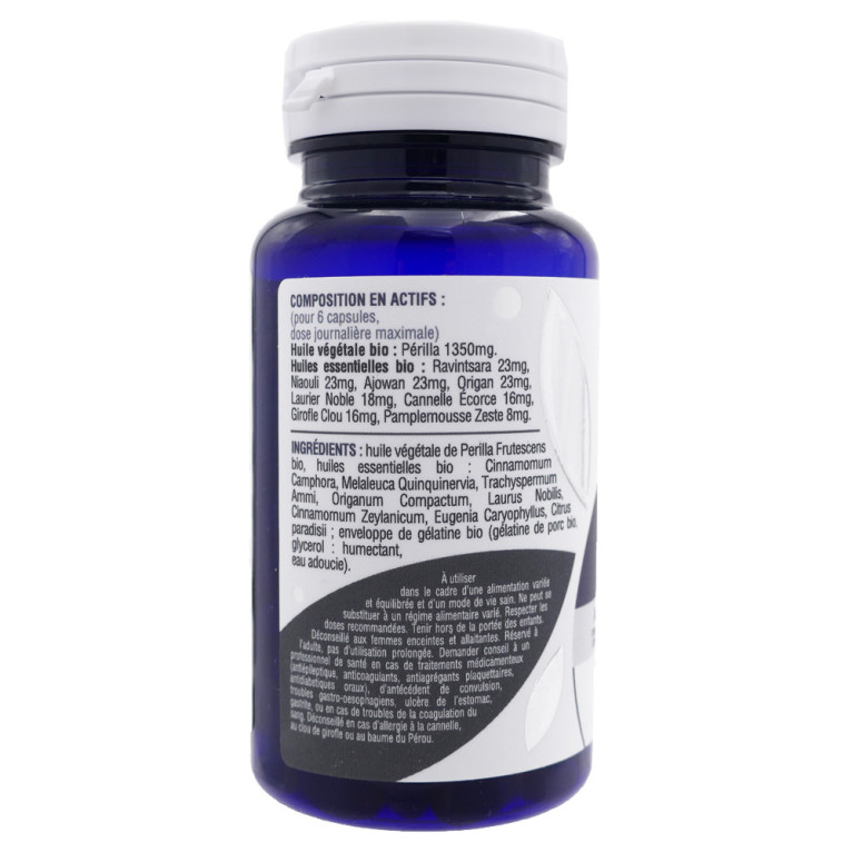 Pour 6 capsules (1500mg), dose journalière maximale : Huile végétale : Périlla bio 1350 mgHuiles essentielles bio : Ravintsara 23mg, Niaouli 23mg, Ajowan 23mg, Origan 23mg, Laurier noble 18mg, Cannelle écorce 16mg, Girofle clou 16mg, Pamplemousse zeste 8mg