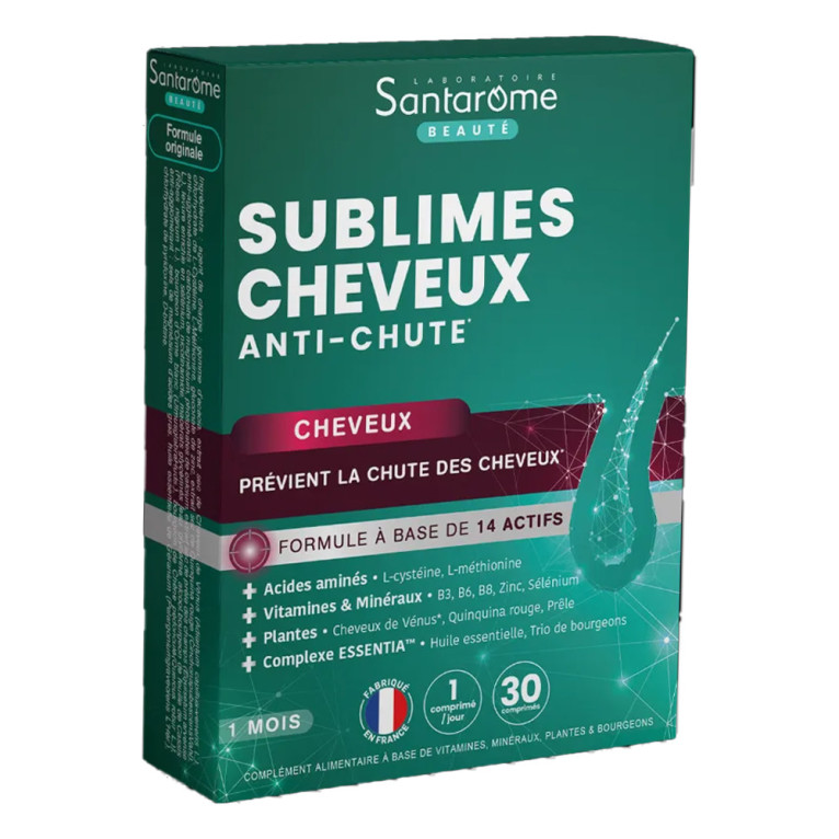 SANTAROME BEAUTE SUBLIMES CHEVEUX ANTI-CHUTE 30 COMPRIMES, en vente en ligne sur le site de votre parapharmacie à prix discount, est un complément alimentaire de qualité supérieure qui aide à lutter contre la chute des cheveux.