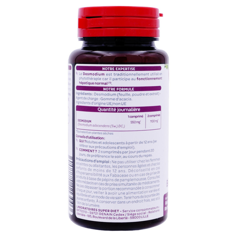Le laboratoire Superdiet, reconnu pour son expertise en compléments alimentaires naturels, propose ce produit à base de Desmodium, une plante originaire d'Afrique de l'Ouest. Le Desmodium est réputé pour contribuer au bon fonctionnement du foie. Il soutient la fonction hépatique, participant ainsi à la protection des cellules hépatiques. En intégrant ce complément alimentaire dans votre routine quotidienne, vous choisissez un allié naturel pour aider au maintien d'une fonction hépatique normale.