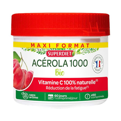 SUPERDIET propose une large gamme de compléments alimentaires à la fois efficaces et sûrs, élaborés avec des plantes issues majoritairement de l’agriculture biologique, pour offrir le meilleur de la nature et apporter des solutions naturelles à tous nos besoins santé et bien-être. Acérola 1000, conditionné sous forme de comprimé à croquer, est un complément alimentaire formulé à base d’Acérola, appelé également cerise du Brésil dont la teneur en vitamine C, 80 fois supérieure à celle de l’orange.