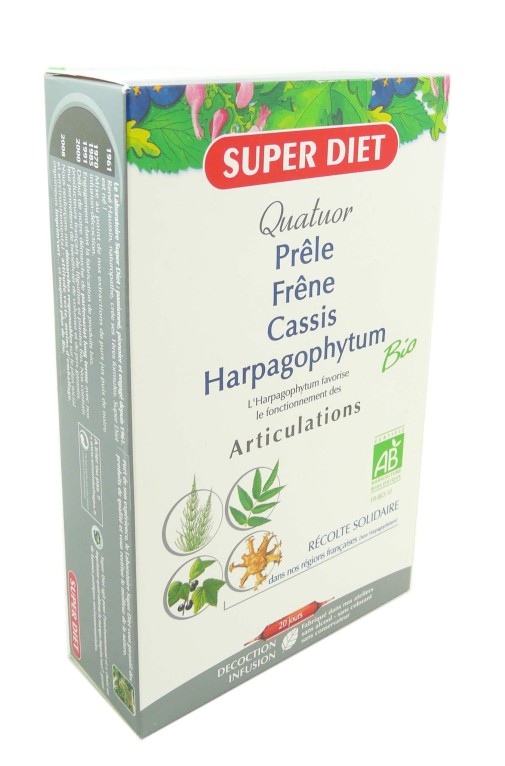 QUATUOR ARTICULATION de SUPERDIET, est un complément alimentaire à base d'harpagophytum, qui contribue à une bonne mobilité articulaire, et de prêle , qui aide au fonctionnement articulaire normal. Du cassis et du frêne, viennent compléter cette formule.