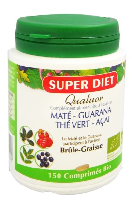 Quatuor Brûle-graisse Bio de SUPERDIET, est à base de maté qui contribue à la dégradation normale des lipides, et de thé vert, qui aide à l'élimination rénale. Du guarana, qui aide au contrôle du poids, et de l'acaï, viennent compléter cette formule.