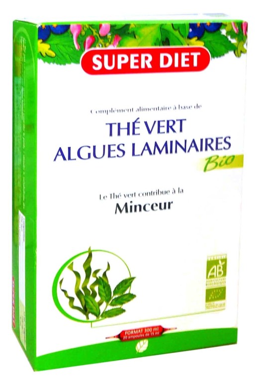 Thé vert Algues Laminaires Bio de SUPER DIET, 55 ans de passion pour restituer le meilleur de la nature dans un complément alimentaire sous forme d’ampoules à diluer qui aide à l’élimination de l’eau dans l’organisme et aide à la perte de poids.
