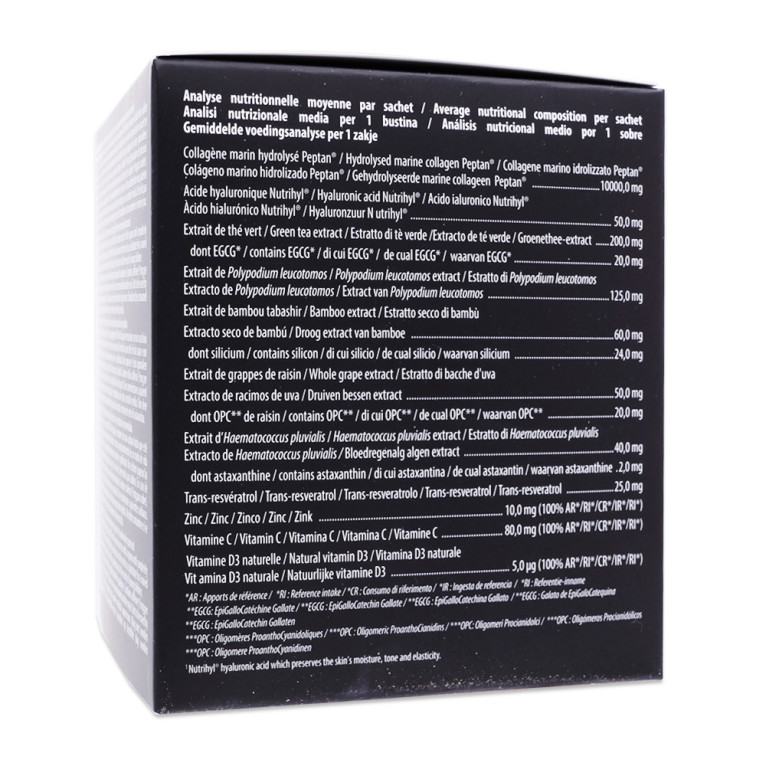 Collagène marin hydrolysé Peptan® (POISSON), arôme naturel fraise, extrait de feuilles de thé vert titré en EGCG*, extrait de rhizome de Polypodium leucotomos, vitamine C (acide L-ascorbique), extrait sec de bambou tabashir exsudat titré en silicium, hyaluronate de sodium Nutrihyl®, extrait de grappes de raisin titré en OPC**, bisglycinate de zinc, oléorésine riche en astaxanthine extraite de l’algue Haematococcus pluvialis, trans-resvératrol, édulcorant : glycosides de stéviol issus de stevia, vitamine D3 naturelle (cholécalciférol).*EGCG : EpiGalloCatéchine Gallate. **OPC : Oligomères ProanthoCyanidoliques
