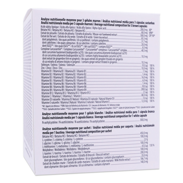 Gélule marron : Agent de charge : phosphate dicalcique, extrait de plante de piloselle (Hieracium pilosella), tunique d'origine végétale, acide alpha-lipoïque, vitamine C (acide L-ascorbique), extrait de feuilles de thé vert (Camellia sinensis) titré en polyphénols et catéchines, bétaïne HCl, complexe Curcussentiel® (extrait sec de racine de Curcuma longa L. fibres de galactomannanes de fenugrec, extrait de rhizome de gingembre (Zingiber officinale) titré en gingérols), bisglycinate de zinc, sélénométhionine, vitamine E naturelle (acétate de D-alpha-tocophéryl), vitamine B3 (nicotinamide), vitamine B5 (calcium D panthothenate), vitamine B6 (pyridoxal 5′-phosphate), vitamine D3 naturelle (cholécalciférol), vitamine B2 (riboflavine 5′-phosphate, sodium), vitamine B1 (mononitrate de thiamine), vitamine B8 (biotine), vitamine B9 (L-méthylfolate de calcium), vitamine B12 (méthylcobalamine).