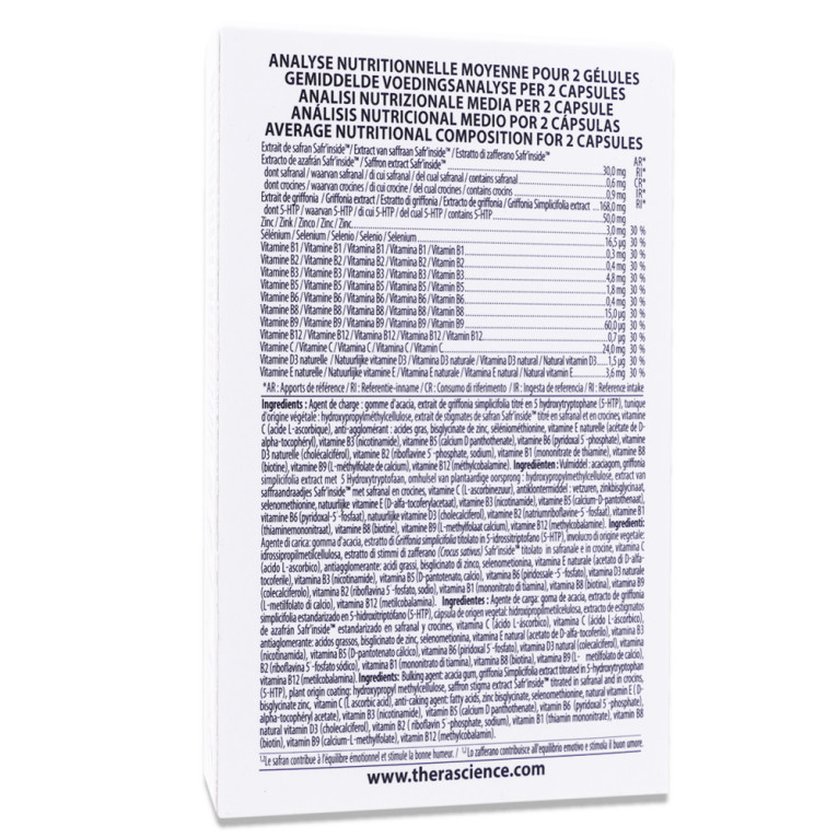 Le laboratoire Thérascience propose une association synergique de 2 bio-actifs, le griffonia et le safran, ainsi que le complexe micronutritionnel Suvimine 13®. Le griffonia est reconnu pour sa capacité à soutenir le fonctionnement du système nerveux. Le safran, sous forme d'extrait breveté Safr’Inside™, contribue à un bon équilibre émotionnel et une humeur positive. Les vitamines B1, B3, B6, B8, B9, B12 et C soutiennent le fonctionnement normal du système nerveux et participent à des fonctions psychologiques normales Le complexe Suvimine 13® assure une biodisponibilité optimale des nutriments essentiels. Ces ingrédients de qualité supérieure sont conçus pour contribuer au soutien des fonctions psychologiques.