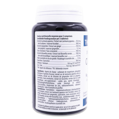 Agents de charge : carbonate de magnésium, phosphate dicalcique et gomme d'acacia, extrait sec de Laminaria japonica titré en fucoïdanes, extrait sec de rhizome de gingembre titré en gingérols, quercétine, trans-resvératrol, extrait de Boswellia serrata titré en acide boswellique, anti-agglomérant : acides gras, agents d'enrobage, acide stéarique et cellulose microcristalline, bisglycinate de zinc, sélénométhionine Lynside® Forte Se+, substance aromatisante : huile essentielle de giroflier..