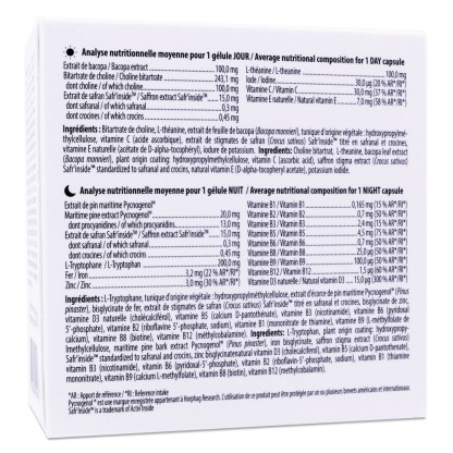 Comprimés NUIT : L-Tryptophane, tunique d'origine végétale : hydroxypropylméthylcellulose, extrait d'écorce de pin maritime Pycnogenol® (Pinus pinaster), bisglycinate de fer, extrait de stigmates de safran (Crocus sativus) Safr'insideTM titré en safranal et crocines, bisglycinate de zinc, vitamine D3 naturelle (cholécalciférol), vitamine B5 (calcium D-pantothénate), vitamine B3 (nicotinamide), vitamine B6 (pyridoxal 5′-phosphate), vitamine B2 (riboflavine 5′-phosphate, sodium), vitamine B1 (mononitrate de thiamine), vitamine B9 (L-méthylfolate de calcium), vitamine B8 (biotine), vitamine B12 (méthylcobalamine).